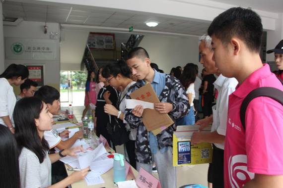 我系在校门口设立“接待处”,由本系学生志愿者在此迎接新生并引导至本系。在教学楼门厅英语角是新生报到地点,系团总支和学生会的同学们热情周到,耐心地解答,迎新工作如火如荼,到处都是忙碌的身影。报到验证、签到注册、办理入住手续等环节进行地有条不紊,新生们井然有序地办理着各项手续。