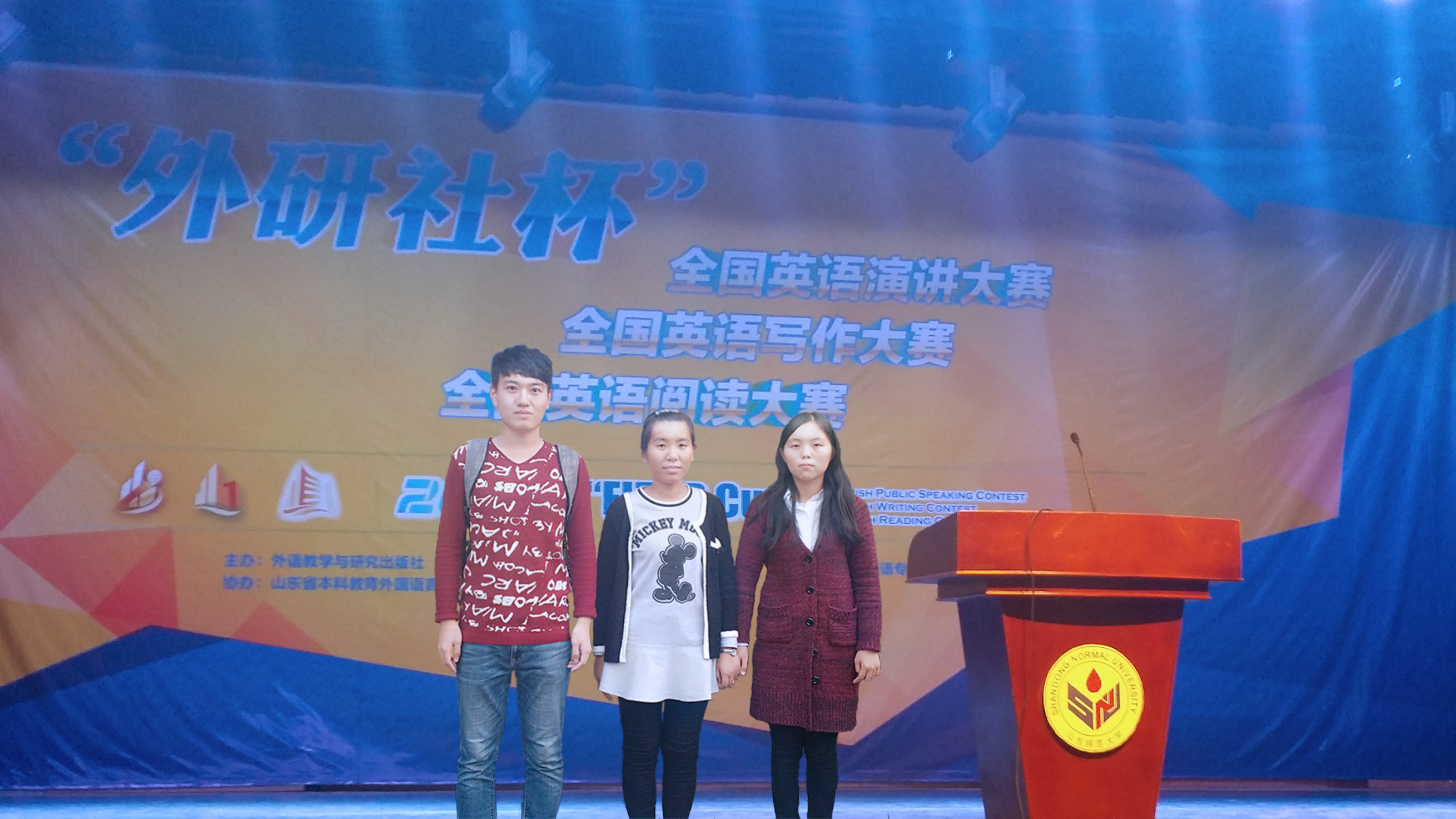 2015年10月24日,“外研社杯”全国英语写作大赛和阅读大赛山东赛区复赛在山东师范大学举行,大赛由外语教学与研究出版社主办、教育部高等学校大学外语教学指导委员会和教育部高等学校英语专业教学指导委员会合办。山东赛区复赛共有省内40余所高校96名选手参加,经过系内初赛选拔的外国语系3名参赛选手全部获奖。李林蔚同学获得“外研社杯”全国英语阅读大赛山东赛区复赛三等奖,刘敬秀同学获得阅读优胜奖和写作三等奖,宋华杰同学获得写作三等奖,范莉获得“省级优秀指导教师”奖。参赛选手所取得的成绩将进一步激发全系学生的学习热情和学习动力。(撰稿范莉 审核杨楠)